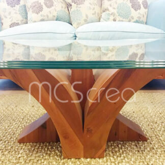 Mesa de centro con cubierta de vidrio 19 mm – canto triple ola. Base de madera modelo Gaviota en Roble de demolición.