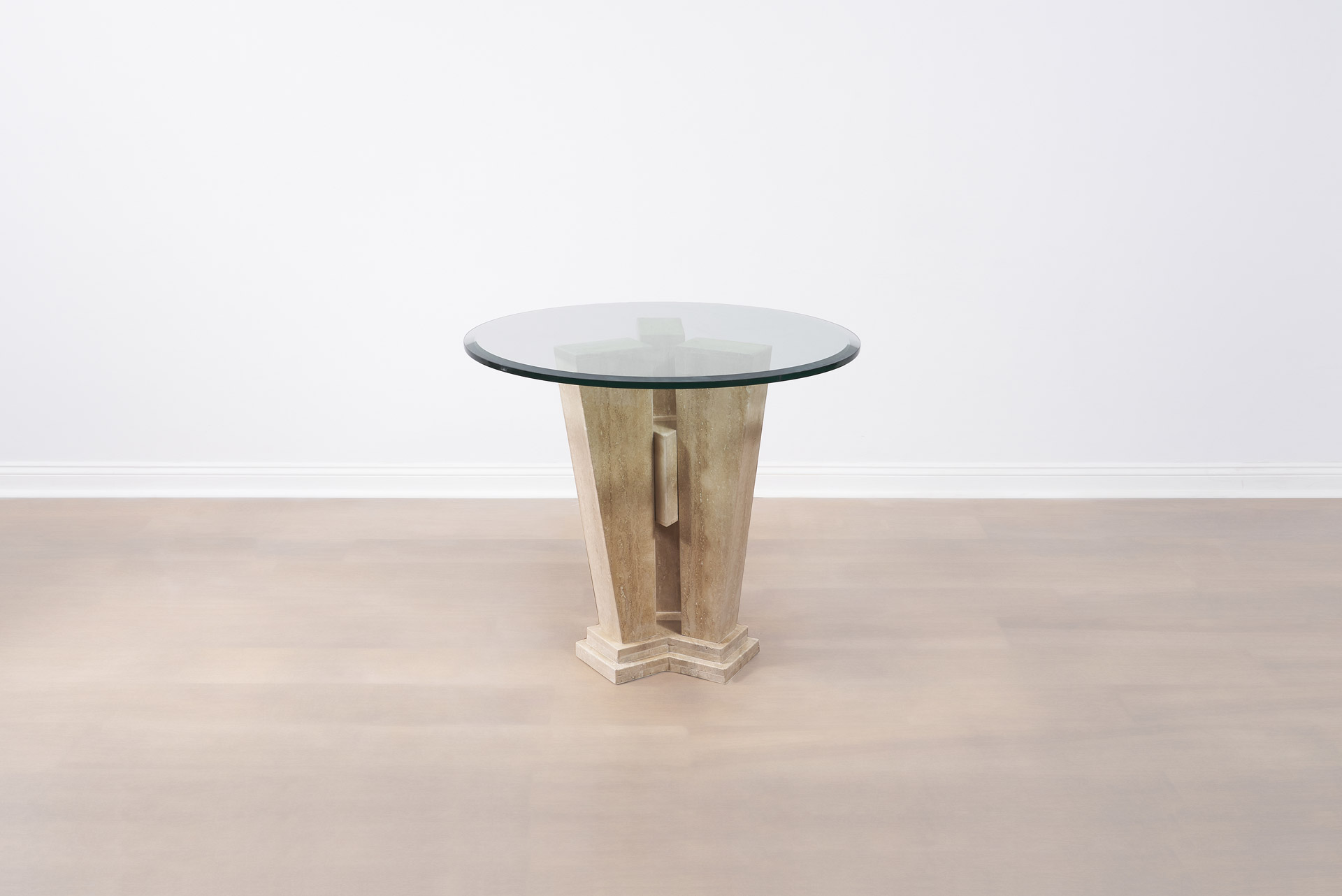 Mesa de comedor circular, con base de mármol Travertino y cubierta de vidrio de gran resistencia en 19 mm de espesor. Este material para bases, se adapta a todo estilo de decoraciones, entregando brillo y luminosidad en el ambiente que se le incorpore.